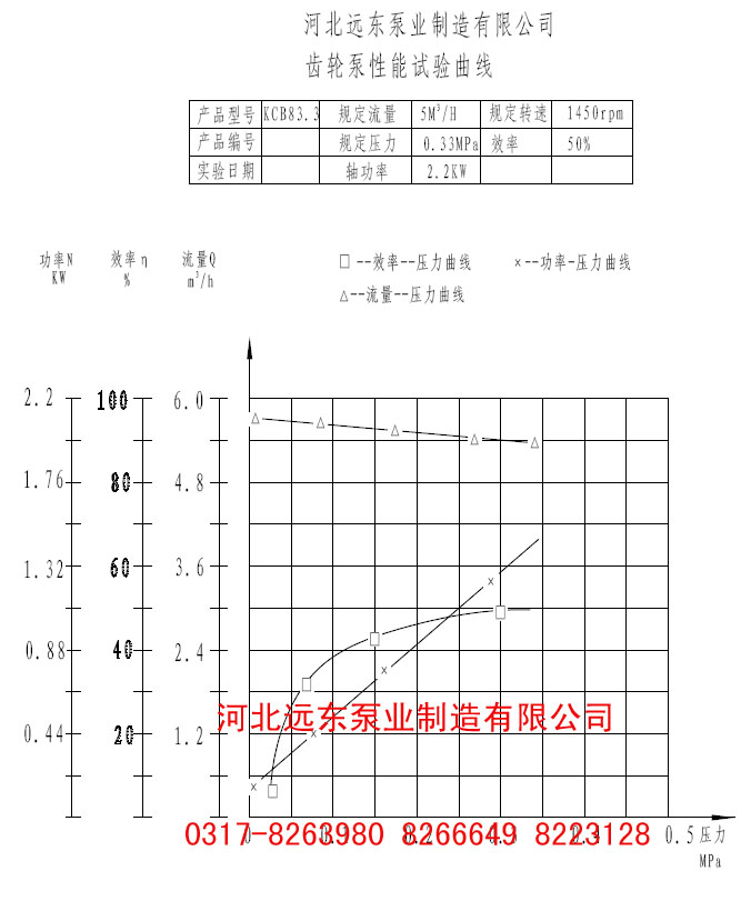 KCB83.3齒輪泵性能試驗(yàn)曲線圖:該齒輪泵流量5m3/h,壓力0.33Mpa,效率50%,軸功率2.2KW |